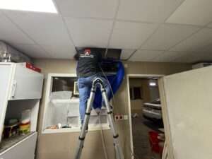 We clear condensate lines, check for coil issues, and replace damaged drain pans to prevent further leaks and water damage.